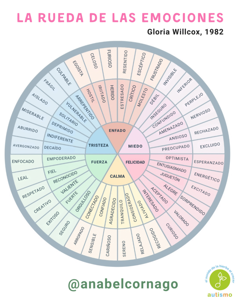 Esta rueda —basada en la propuesta original de Gloria Willcox (1982) y traducida por mí al español— es una herramienta visual para ayudarte a explorar, identificar y nombrar lo que sientes.