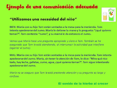MAL: María con su hijo Tom están sentados a la mesa para la merienda. Tom intenta apoderarse del zumo. María, sin tener la atención de Tom, le dice: “Mira qué rico todo, hay leche, galletas, zumo, agua, ¿qué quieres tomar?”. Tom sigue intentando apoderarse del zumo.