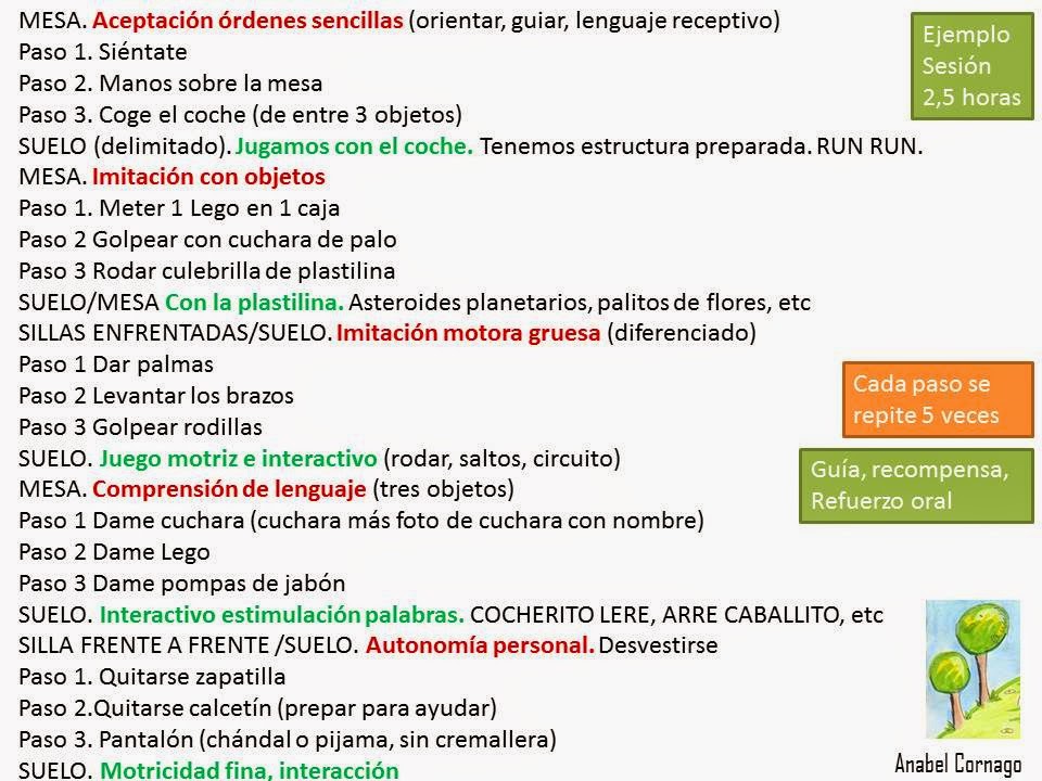 En cada sesión se trabajan distintos programas: nosotros comenzamos con imitación motora gruesa, imitación con objetos, comprensión de lenguaje, aceptación de órdenes, desvestirse.. y en seguida a la estimulación de las primeras palabras., sin dejar nunca de lado la estimulación sensorial (primero el tacto y el contacto corporal)